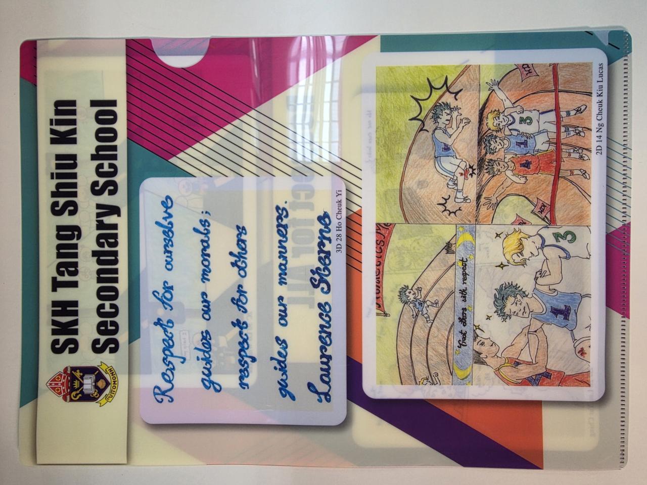 To further promote respect through creativity, the Moral, Civic and National Education Committee and the Visual Arts Department jointly organized a File Design Competition on the theme “Respect”. The winning designs, submitted by 2C Lo Wing Yee, 2D Lau Yat Ching, 2D Ng Cheuk Kiu Lucas, and 3D Ho Cheuk Yi, were printed on file folders distributed to all staff and students, symbolizing the spirit of respect in our school.